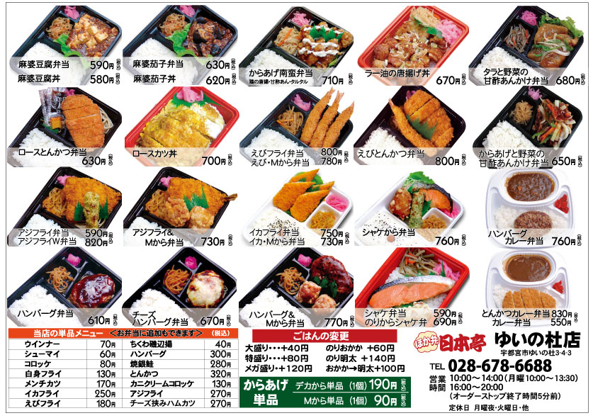 (当ページのメニューはゆいの杜店のお持ち帰りメニューです) TEL:028-678-6688