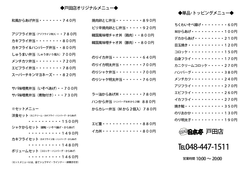 (当ページのメニューは戸田店のお持ち帰りメニューです)