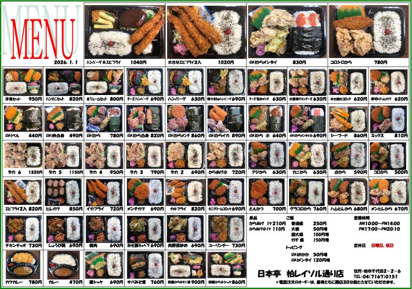 (当ページのメニューは柏レイソル通り店のメニューです)TEL:04(7167)0151